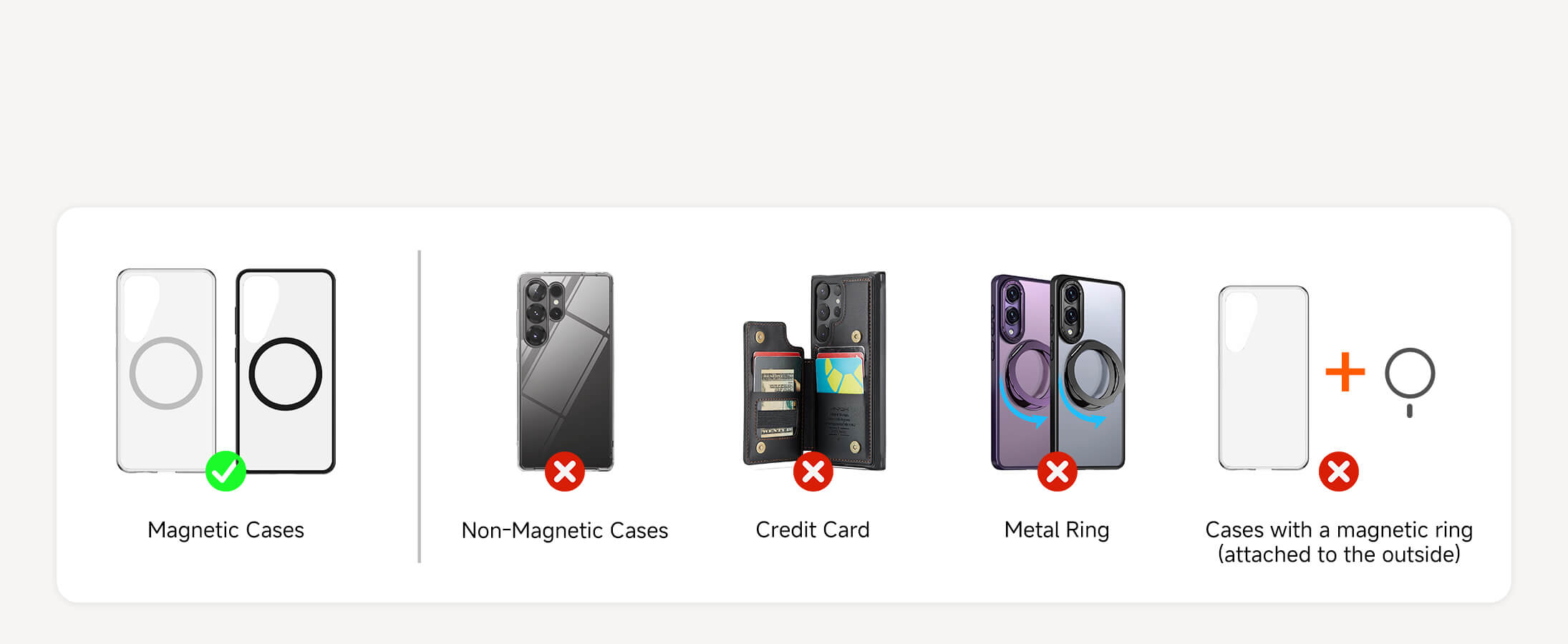 This charger uses magnetic wireless charging and only supports phones equipped with a magnetic case. Without it, the phone cannot attach securely for proper charging. Please ensure your phone supports wireless charging and is used with a magnetic case.