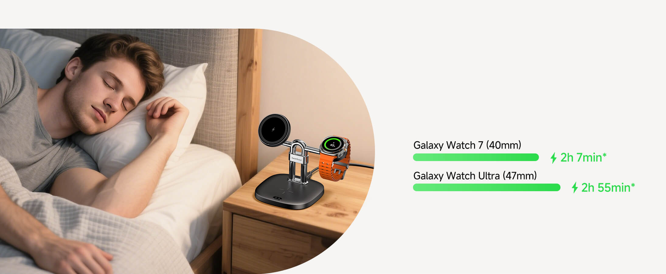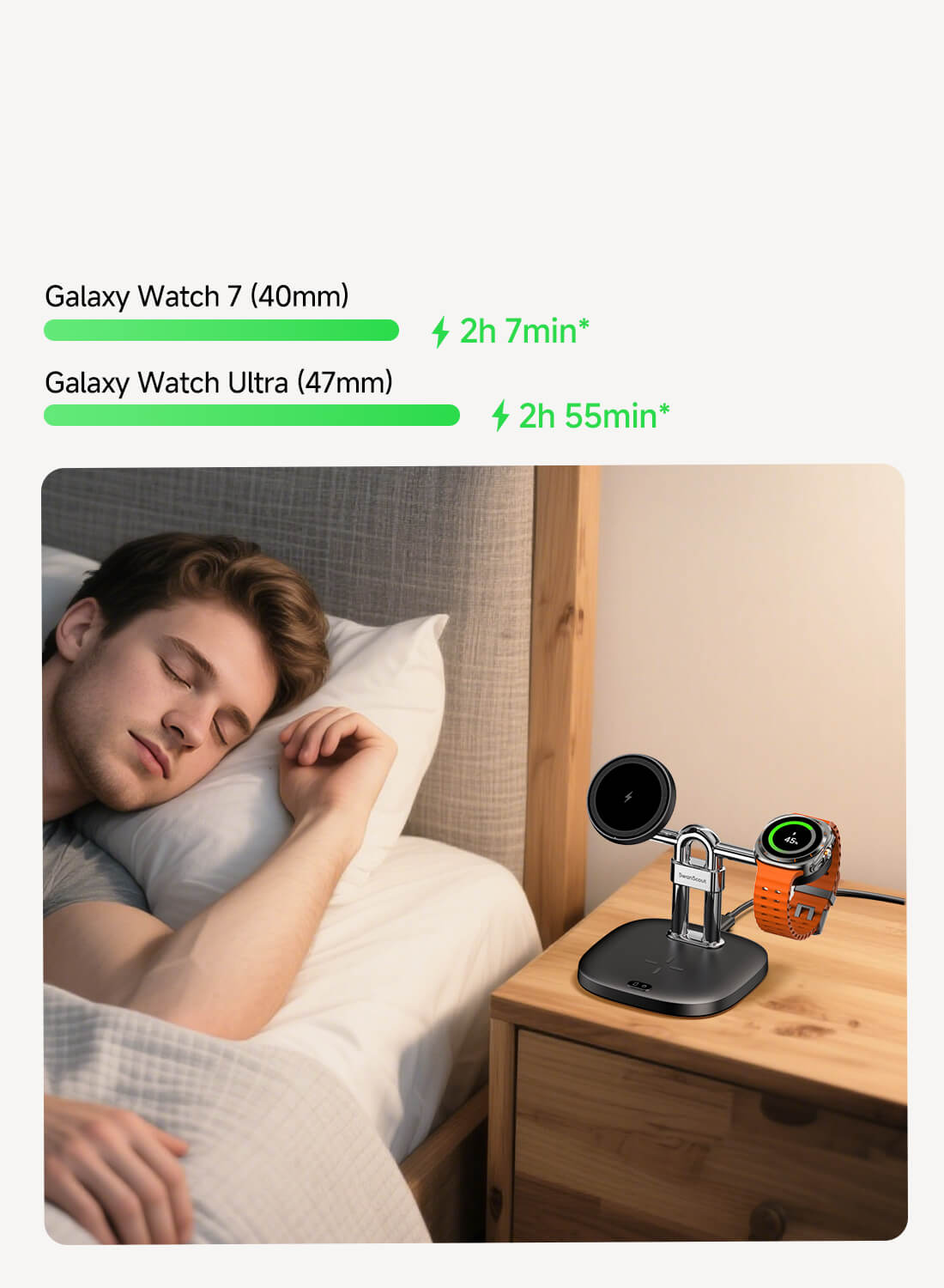 - Watch charging area supports 3W fast charging; Galaxy Watch 7 (40mm) reaches 0–80% in just 1h 20min.