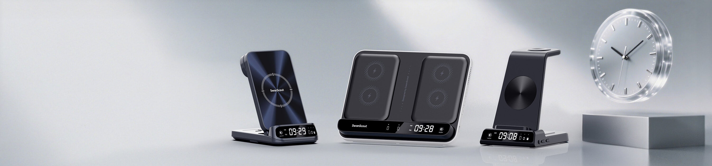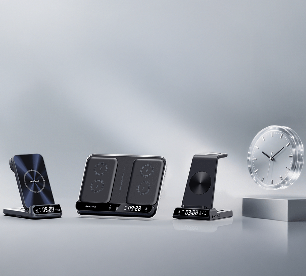 Les chargeurs sans fil SwanScout allient une charge magnétique rapide à une horloge numérique claire dans un seul appareil élégant. Que ce soit à votre bureau, à votre chevet ou dans votre espace d'étude, vous pouvez recharger votre téléphone et respecter vos horaires, tout en conservant un espace propre et organisé.