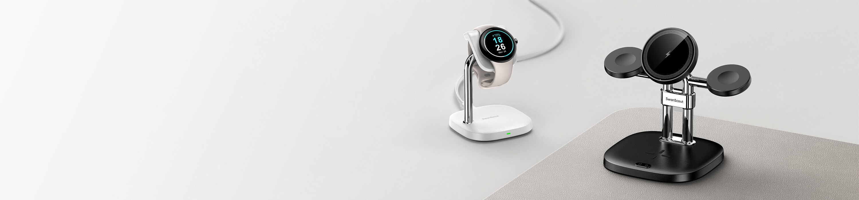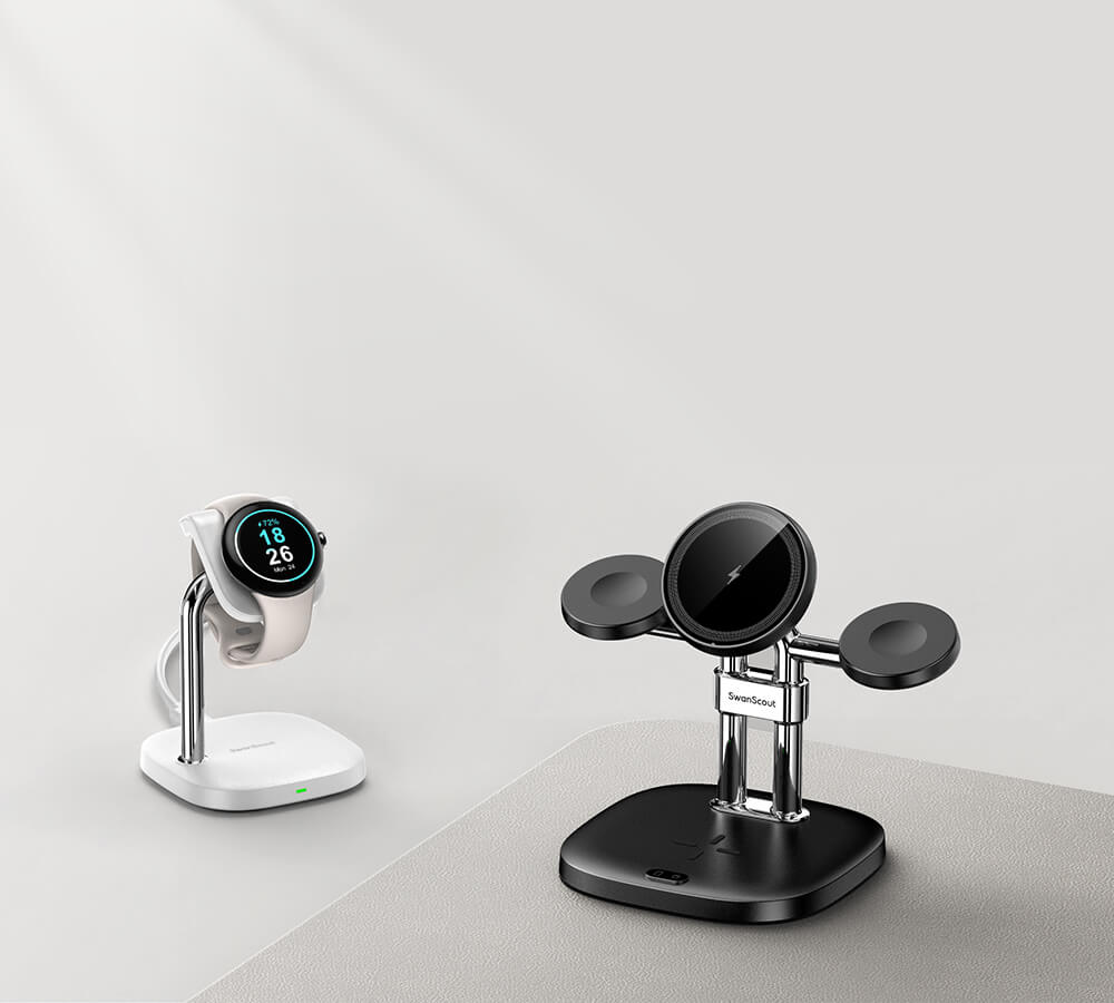 Équipés d'un support métallique robuste, les chargeurs SwanScout maintiennent fermement votre montre et vos autres appareils en position verticale et horizontale, garantissant ainsi leur stabilité et leur stabilité. Ce support, conçu avec soin, améliore la facilité d'utilisation tout en prévenant efficacement les chutes et les dommages accidentels, pour une recharge en toute sérénité.
