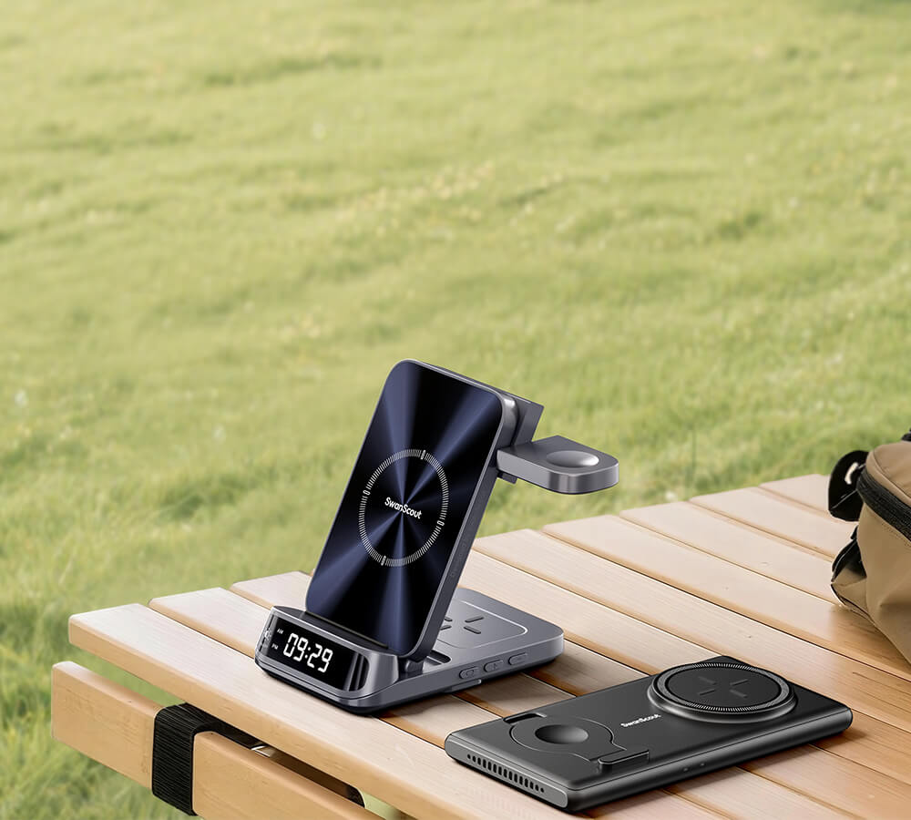 SwanScout 502S is a 2-in-1 Samsung wireless charger, featuring a foldable design for the watch, providing both convenience and functionality.