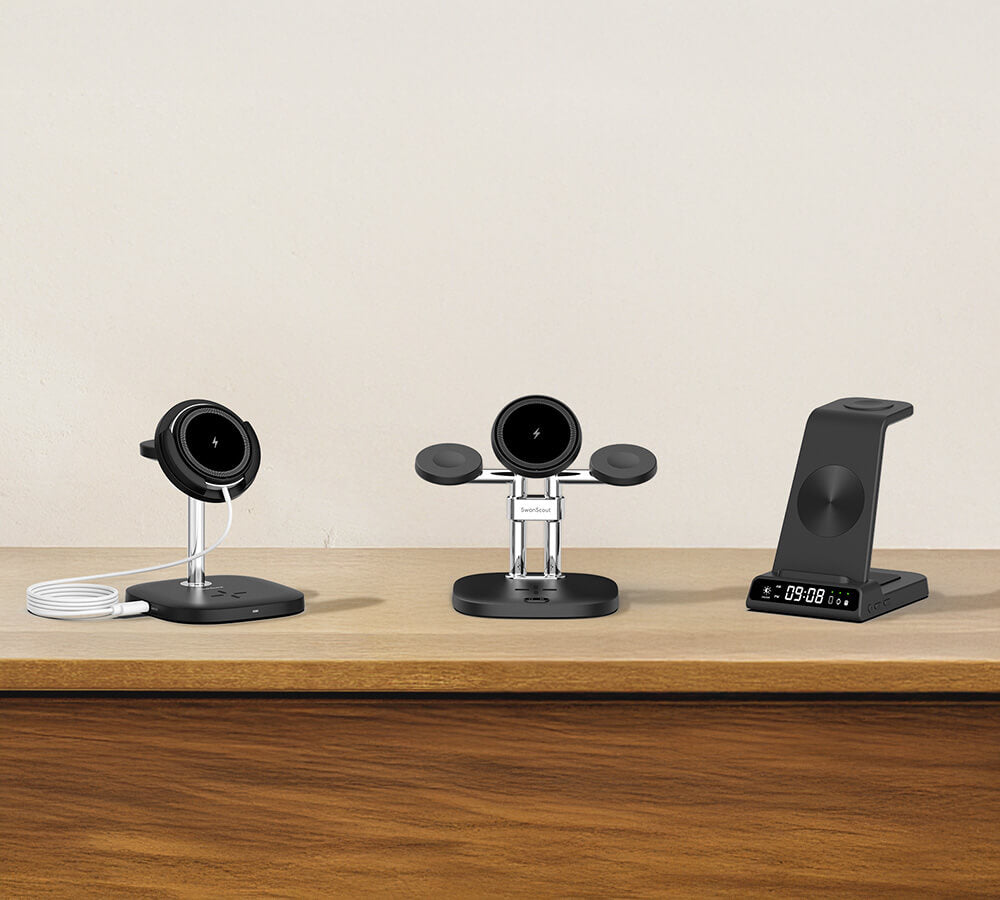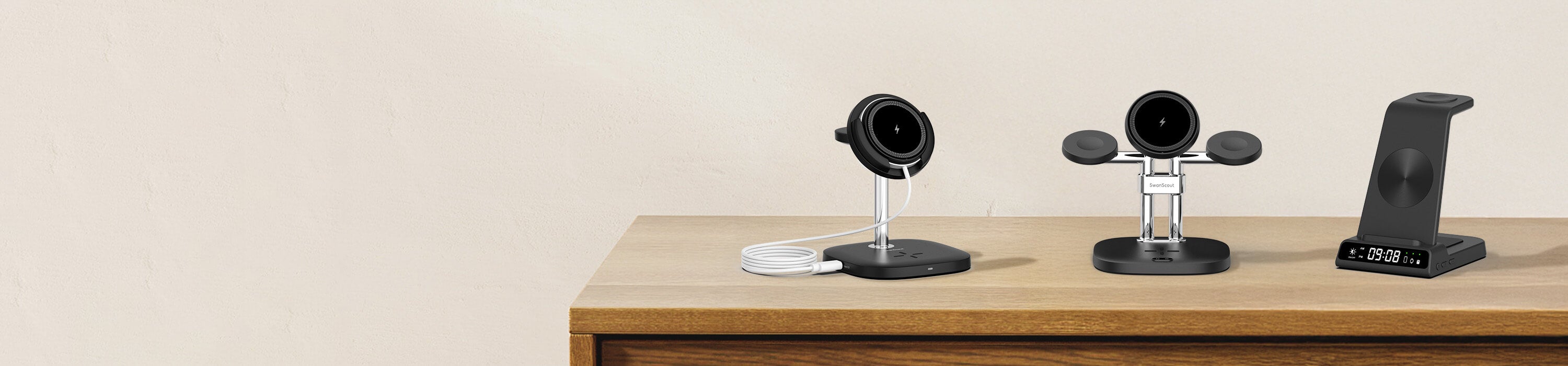 Les chargeurs SwanScout pour Apple sont conçus pour une efficacité et un professionnalisme optimaux au travail. Le support réglable de la station de bureau permet de charger et d'utiliser simultanément l'iPhone 17 Pro, optimisant ainsi les visioconférences et l'accès aux notifications. La technologie de charge rapide MagSafe 15 W assure une alimentation rapide et stable, adaptée aux horaires de travail exigeants. Un système de contrôle thermique intelligent intégré prévient la surchauffe, tandis que le cache-câbles assure un espace de travail propre et professionnel.