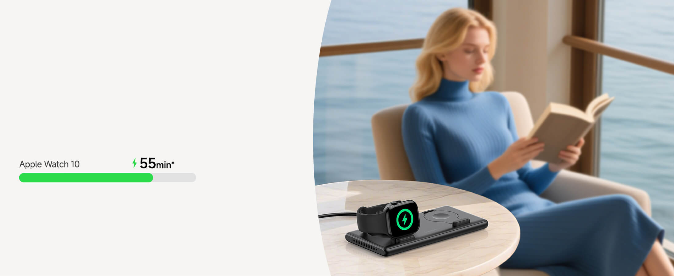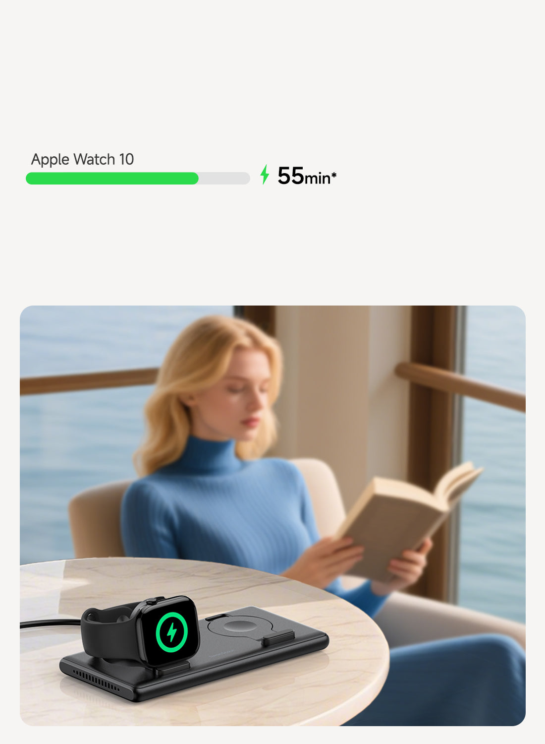 - Fournit une charge rapide de 5 W – de 0 % à 80 % en 55 minutes pour l’Apple Watch Series 10 (46 mm).