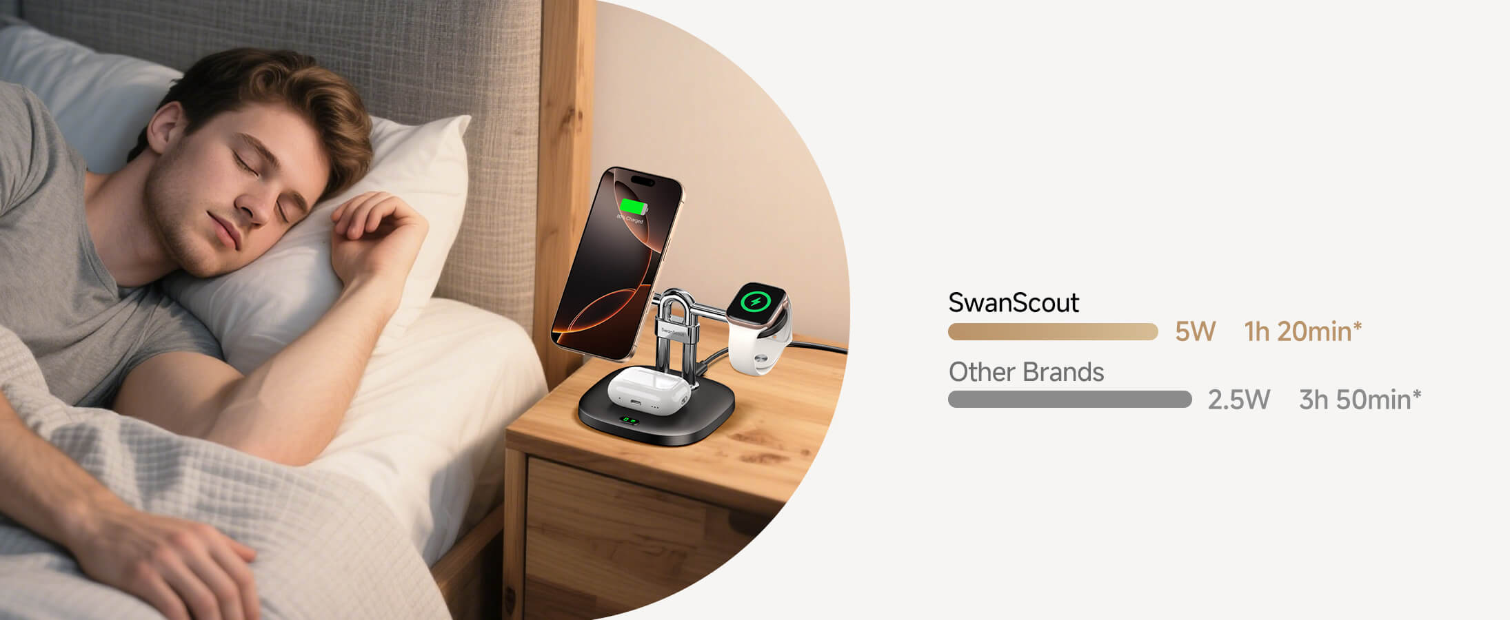 • Profitez d’une charge rapide de 5 W pour Apple Watch, atteignant 80 % en seulement 51 minutes — 47 % plus rapide que les chargeurs standards de 2,5 W.