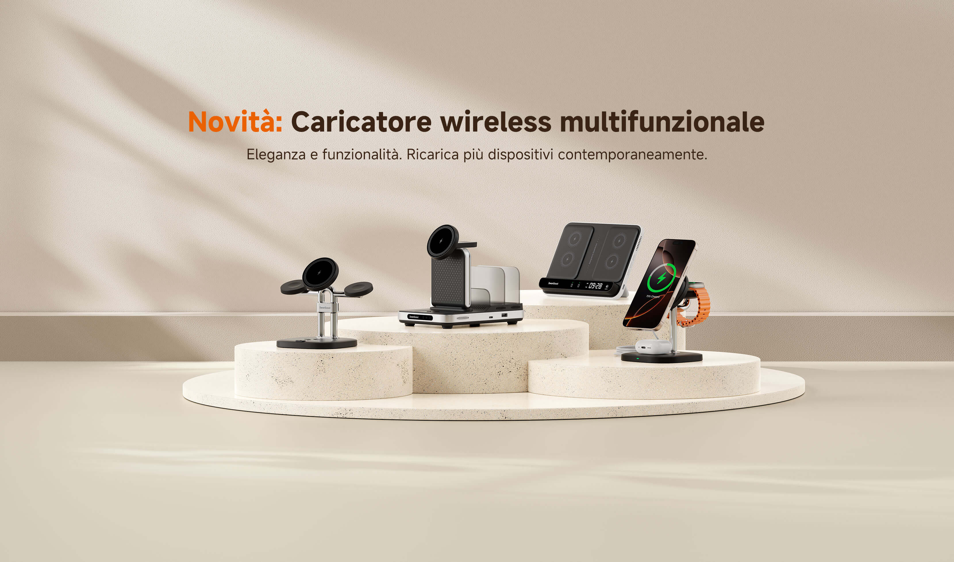 "È ben fatto e offre la possibilità di caricare contemporaneamente telefono, auricolari e orologio. La funzione orologio lo rende perfetto per il comodino: carica tutto durante la notte, pronto per l'uso in giornata. "