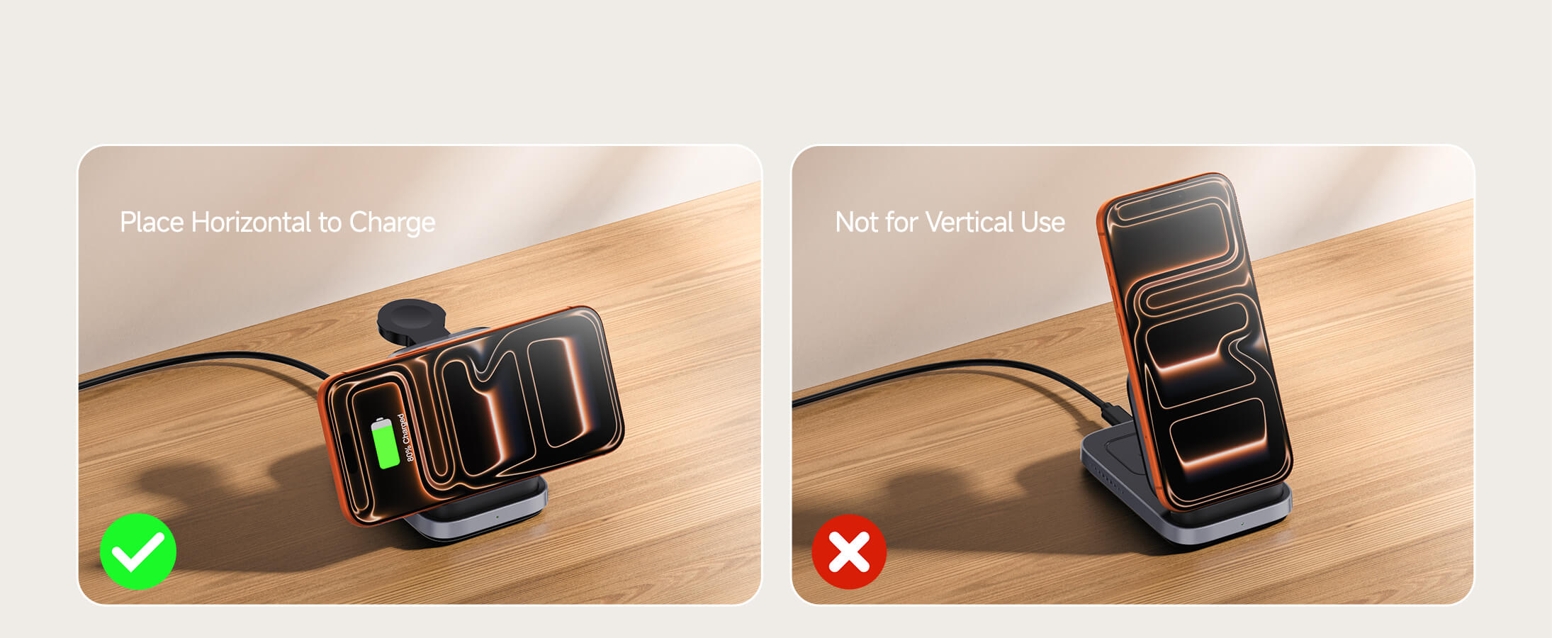 - Horizontális telefon töltés: Töltse telefonját fekvő módban, hogy kényelmesen nézhesse a videókat vagy böngészhessen töltés közben.
