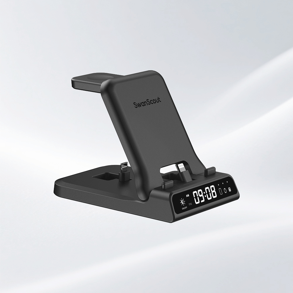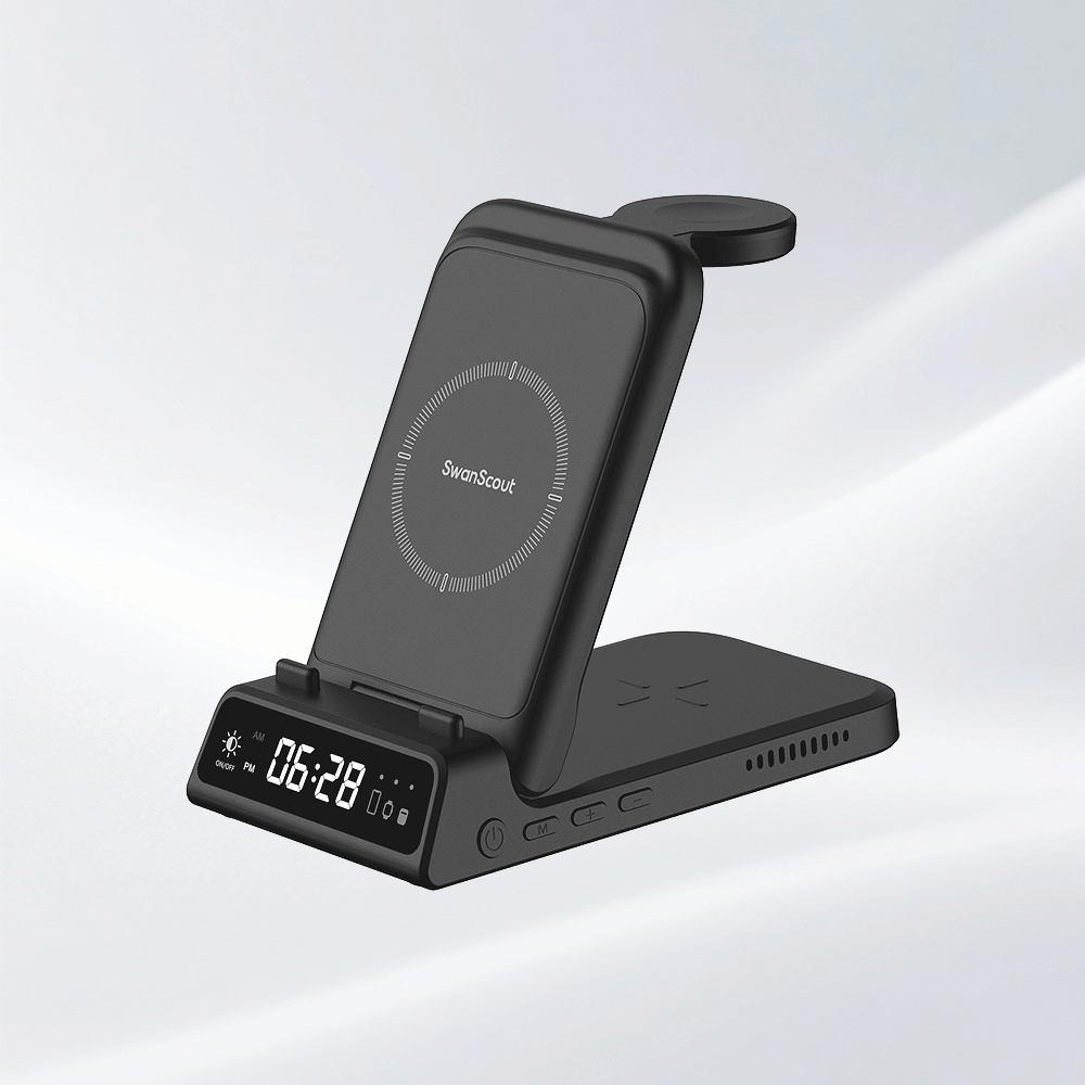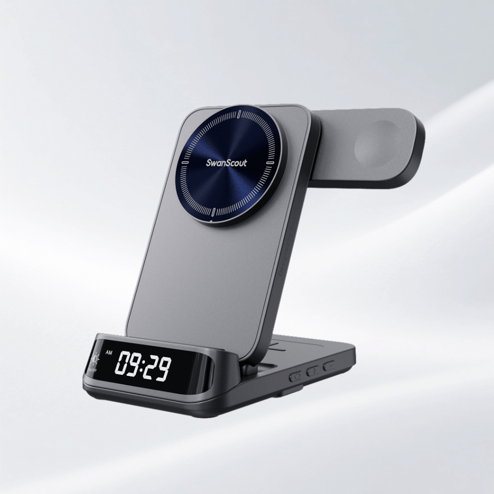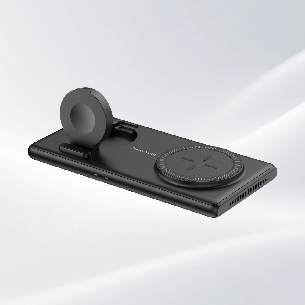 SwanScout’s 3-in-1 charging station supports non-Apple devices compatible with wireless charging standards (e.g., select Android phones and wireless earbuds) for the phone and earbud areas, but the watch area is exclusive to Apple Watch. For magnetic charging, devices prior to iPhone 12 require magnetic compatibility or a magnetic case.