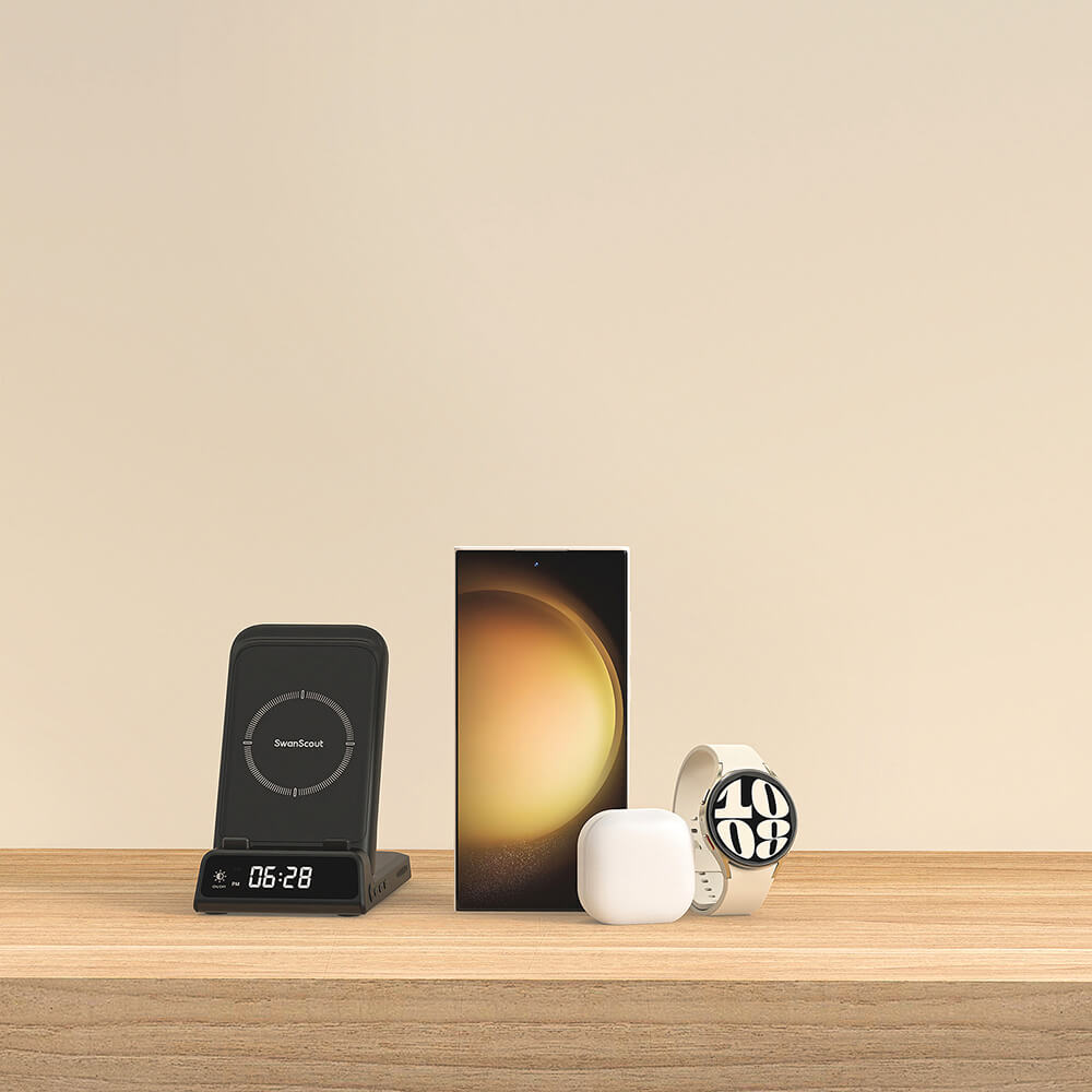 "Mi piace molto questa stazione di ricarica rapida Swanscout. Come proprietario di un galaxy s23 e di un samsung watch 5 questa è un'ottima soluzione di ricarica. Nella confezione si trova il supporto di ricarica, un cavo di ricarica e una spina da 25W, quindi tutto ciò che serve è proprio nella scatola. "