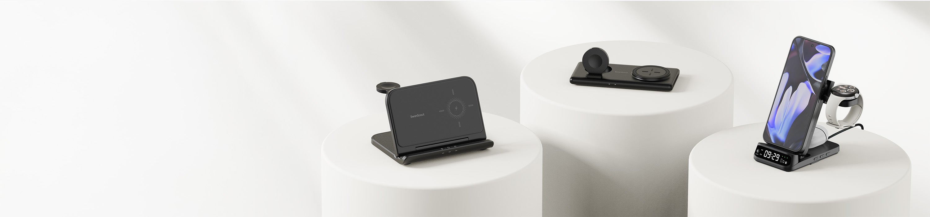 Os carregadores sem fios dobráveis da SwanScout suportam geralmente dois modos de carregamento: Coloque o carregador de pé para segurar o telefone na vertical, ideal para ver conteúdos ou verificar mensagens durante o carregamento. Se o carregamento não estiver a funcionar, tente ajustar o ângulo de dobragem para um melhor alinhamento com a bobina do telefone. Quando colocado na horizontal, o carregador pode alimentar telefones ou auscultadores sem fios. Para auscultadores, alinhe-os com o ícone da bobina marcado na base de carregamento para um posicionamento preciso. Este design flexível suporta vários layouts de dispositivos e melhora a conveniência e a compatibilidade.