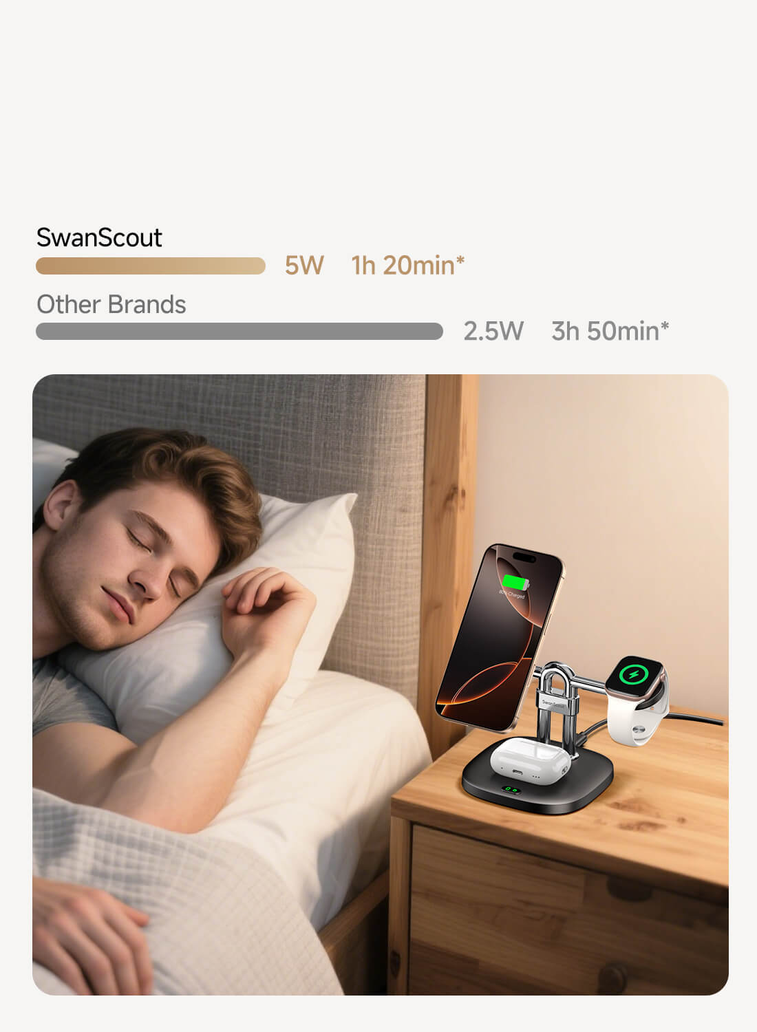 - Bucurați-vă de încărcare rapidă de 5W pentru Apple Watch, atingând 80% în doar 51 de minute — 47% mai rapid decât încărcătoarele standard de 2,5W.