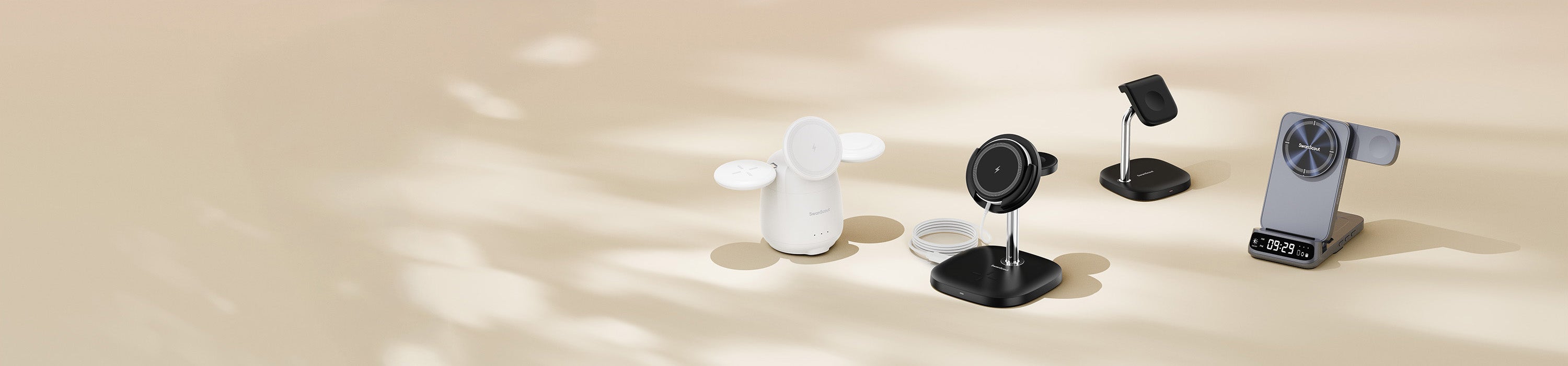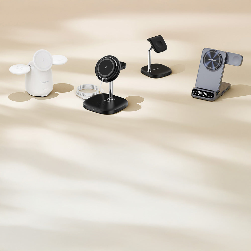 SwanScouts Apple-kompatibla trådlösa laddare har en arkitektur med flera spolar och precis inriktning för att stödja MagSafe-kompatibla iPhones, Apple Watch Series 10 till Ultra och Qi-kompatibla AirPods. De är utformade för samtidig laddning med optimerad strömfördelning, vilket eliminerar kabeltrassel samtidigt som de upprätthåller en stabil uteffekt för alla enheter. De är perfekta för användning hemma och på kontoret och levererar effektiv, organiserad ström som är anpassad till Apples ekosystem.