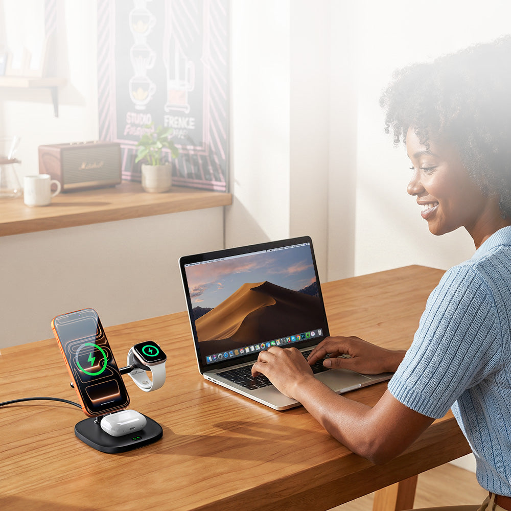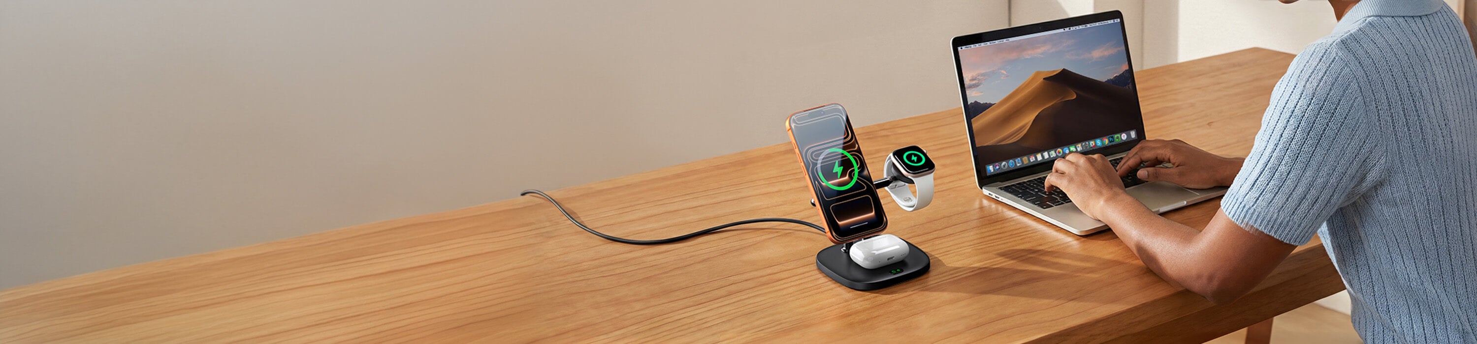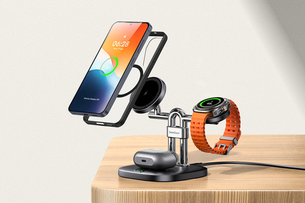 Upptäck SwanScouts eleganta trådlösa laddare för hem och kontor. Elegant design med smart snabbladdning av flera enheter för telefon, hörlurar och klocka.