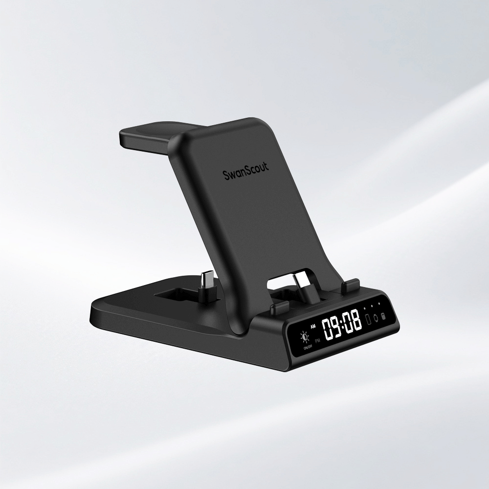 SwanScout 的三合一充電座支援相容無線充電標準的非三星裝置(例如部分 iPhone 或 Android 手機和無線耳機),手機和耳機區域均可充電,但手錶區域僅限 Galaxy Watch 使用。對於磁吸充電,三星手機需要搭配磁吸式充電殼才能正常充電。